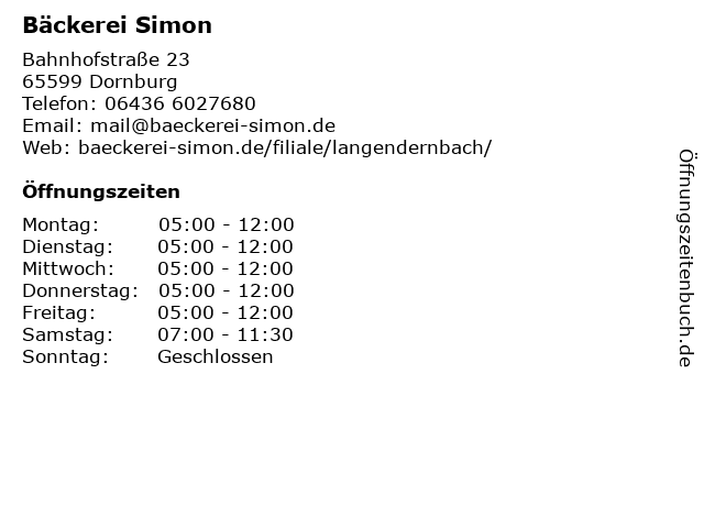 | Öffnungszeiten Bäckerei Simon in Dornburg anzeigen | |