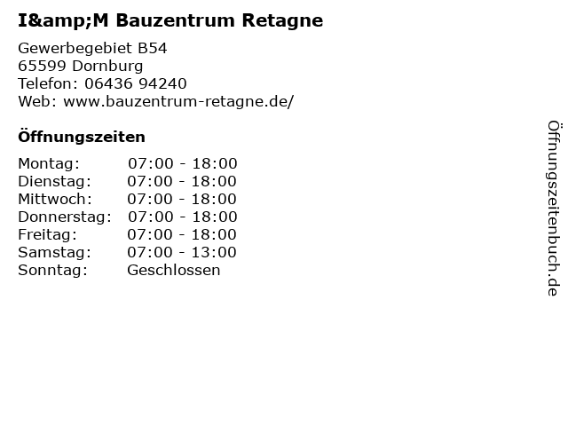 | Öffnungszeiten I&M Bauzentrum Retagne in Dornburg anzeigen | |
