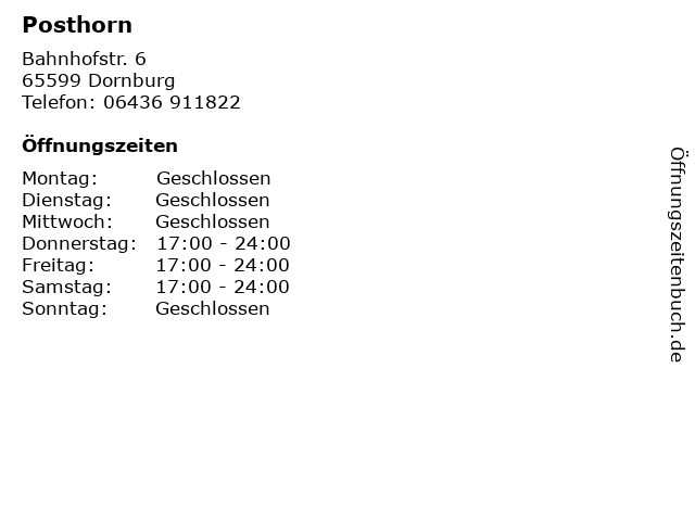 | Öffnungszeiten Posthorn in Dornburg anzeigen | |