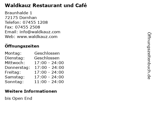 | Öffnungszeiten Waldkauz Restaurant und Café in Dornhan anzeigen | |