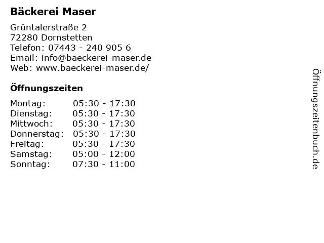 | Öffnungszeiten Bäckerei Maser in Dornstetten anzeigen | |