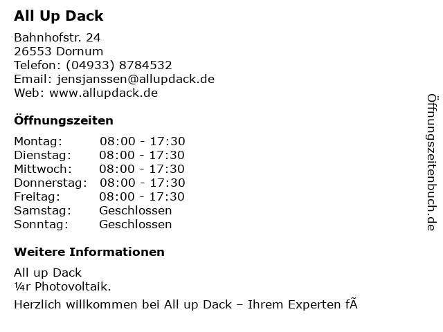 | Öffnungszeiten All Up Dack in Dornum anzeigen | |