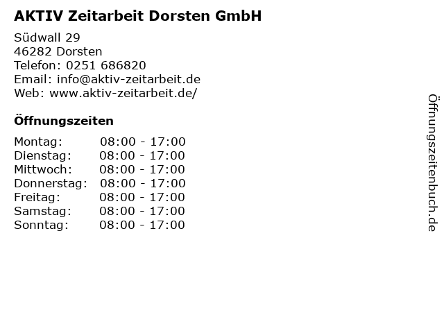 | Öffnungszeiten AKTIV Zeitarbeit Dorsten GmbH in Dorsten anzeigen | |