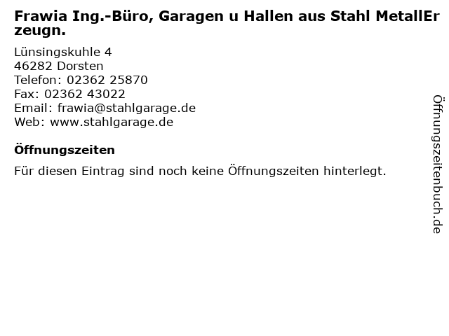 | Frawia Ing.-Büro, Garagen u Hallen aus Stahl MetallErzeugn. anrufen | |