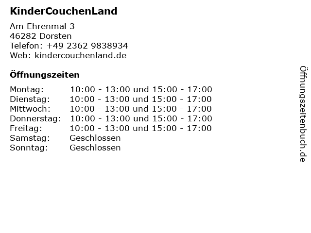| Öffnungszeiten KinderCouchenLand in Dorsten anzeigen | |