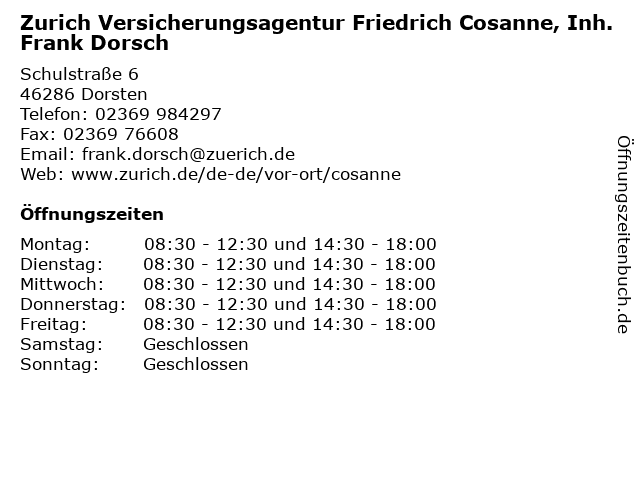 5 Zurich Versicherungen - Generalagentur Friedrich Cosanne, Inh. Frank Dorsch (Entfernung: 0,59 km) Schulstr. 60, 46286 Dorsten 6 |