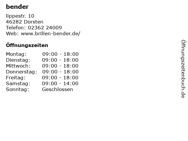| Öffnungszeiten bender in Dorsten anzeigen | |