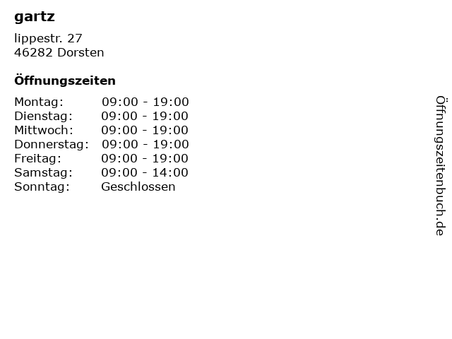 | Öffnungszeiten gartz in Dorsten anzeigen | |