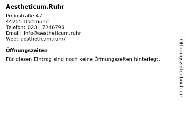 | Öffnungszeiten Aestheticum.Ruhr in Dortmund anzeigen | |
