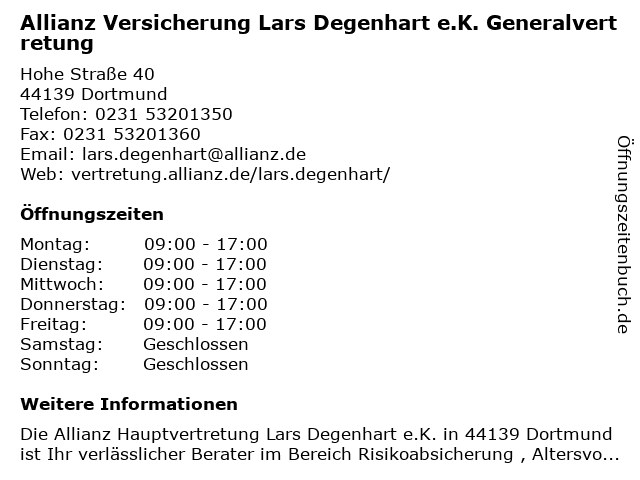 4 Allianz Versicherung GV Bazzanella Inh. Harald Wittek e.K. Generalvertretung (Entfernung: 1,72 km) Märkische Straße 157, 44141 Dortmund 5 Allianz Versicherung Bülent Yildirim Generalvertretung (Entfernung: 1,74 km) Kielstraße 4, 44145 Dortmund 6 Allianz Versicherung Gehring und Bogdanovic GbR Generalvertretung (Entfernung: 3,70 km) Körner Hellweg 126, 44143 Dortmund |