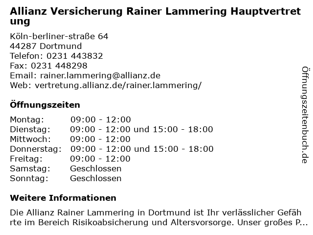 2 Rainer Lammering Allianz Agentur Versicherungsagentur (Entfernung: 0,34 km) Köln-Berliner-Str. 64, 44287 Dortmund 3 4 Rainer Golkowski Schornsteinfegermeister SGK GmbH Regionalleiter Ruhrgebiet (Entfernung: 1,10 km) Am Hilgenbaum 15, 44269 Dortmund 6 |