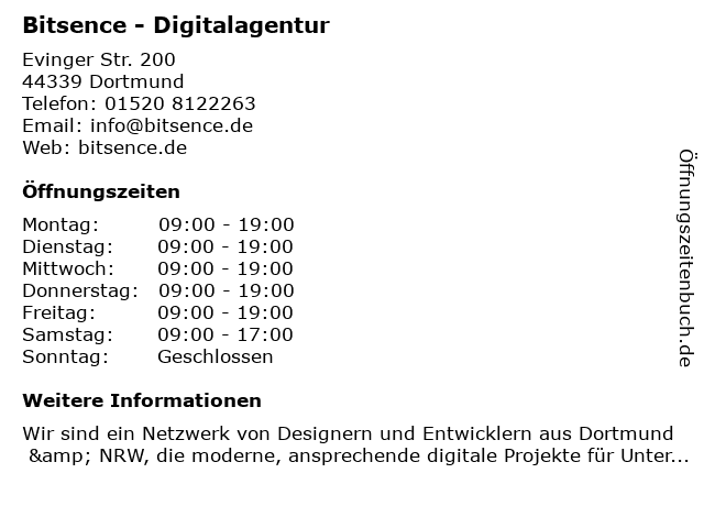 | Öffnungszeiten Bitsence - Digitalagentur in Dortmund anzeigen | |