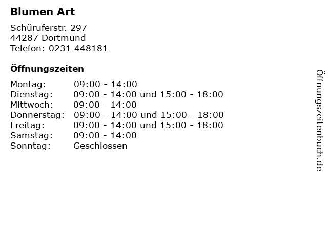 | Öffnungszeiten Blumen Art in Dortmund anzeigen | |