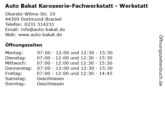1 Auto Bakat Karosserie-Fachwerkstatt - Büro (Entfernung: 0,00 km) Oberste-Wilms-Straße 19, 44309 Dortmund 2 3 Alarich Bechtoldt Karosserie- und Fahrzeugbau (Entfernung: 8,07 km) Dorstfelder Hellweg 66, 44149 Dortmund 6 |
