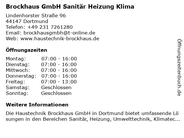 1 Prima- Klima- Wärme- und Klimatechnik GmbH Klimatechnik (Entfernung: 1,91 km) Speicherstr. 33, 44147 Dortmund 2 Krogmann & Schüssler GmbH Heizung Sanitär und Klima (Entfernung: 2,95 km) Wittichstr. 23, 44339 Dortmund 4 pädagogisch therapeutisches Zentrum Brockhaus-Berndt, Fischer-Brockhaus (Entfernung: 4,42 km) Essener Straße 20, 44139 Dortmund 6 |