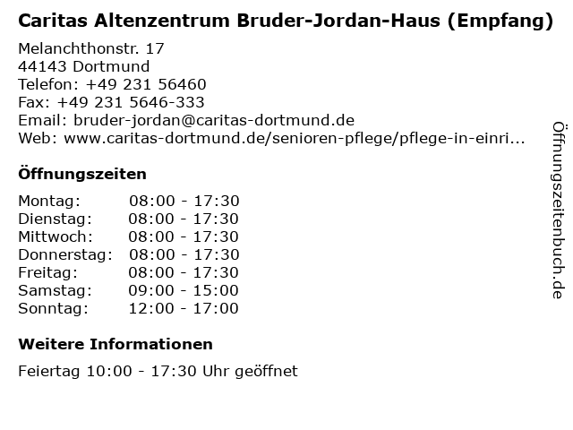 1 Caritas Altenzentrum Bruder-Jordan-Haus (Verwaltung) (Entfernung: 0,01 km) Melanchthonstraße 17, 44143 Dortmund 5 Fritz-Heuner-Heim Evangelisches Altenzentrum (Entfernung: 5,50 km) Stockumer Str. 274 -276, 44225 Dortmund 6 Caritas Dortmund Wohn- und Pflegezentrum St. Josef (Empfang) (Entfernung: 6,69 km) Altenderner Str. 73, 44329 Dortmund |