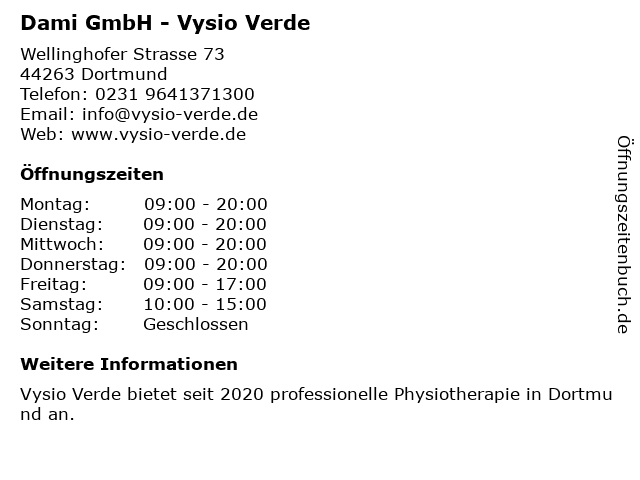 | Öffnungszeiten Dami GmbH - Vysio Verde in Dortmund anzeigen | |
