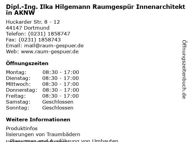3 pur.buero architektur für innen Uta Ortwein Innenarchitektin Uta Ortwein (Entfernung: 4,94 km) Konrad-Adenauer-Allee 10, 44263 Dortmund 4 Gudrun Kaltenborn Landschaftsarchitektin AKNW (Entfernung: 8,66 km) Am Stadtgarten 27, 44575 Castrop-Rauxel 6 Wirges Andreas u. Dr. Hilgemann Friederike Gemeinschaftspraxis Ärzte für Allgemeinmedizin (Entfernung: 13,01 km) Sally-Grünewald-Str. 1, 58313 Herdecke |