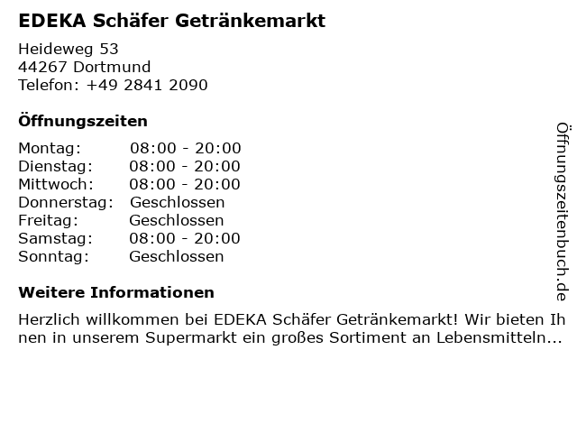 | Öffnungszeiten EDEKA Schäfer Getränkemarkt in Dortmund anzeigen | |