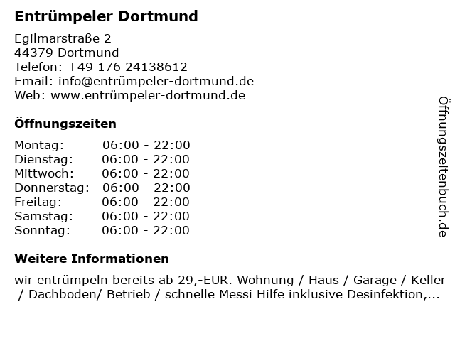 | Öffnungszeiten Entrümpeler Dortmund in Dortmund anzeigen | |