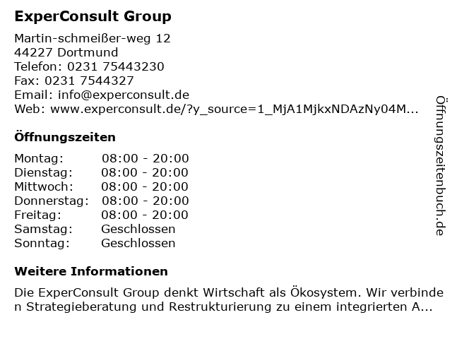 | Öffnungszeiten ExperConsult Group in Dortmund anzeigen | |