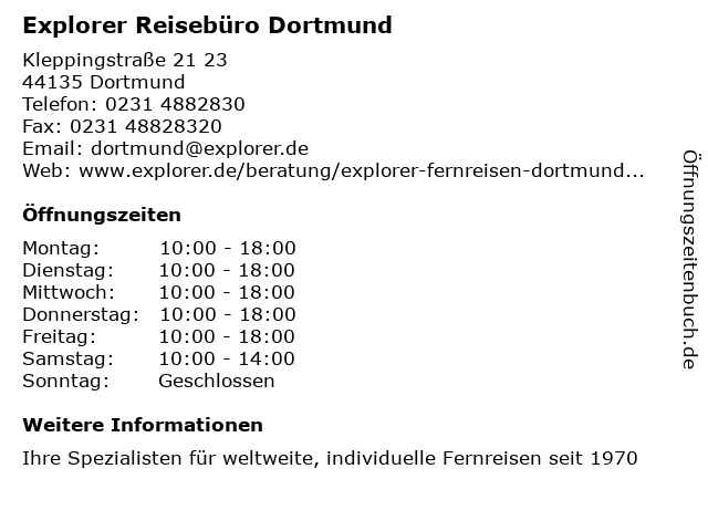 | Öffnungszeiten Explorer Reisebüro Dortmund in Dortmund anzeigen | |