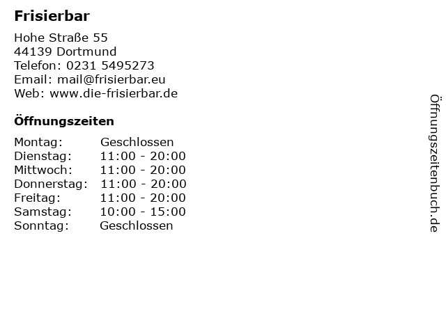 | Öffnungszeiten Frisierbar in Dortmund anzeigen | |