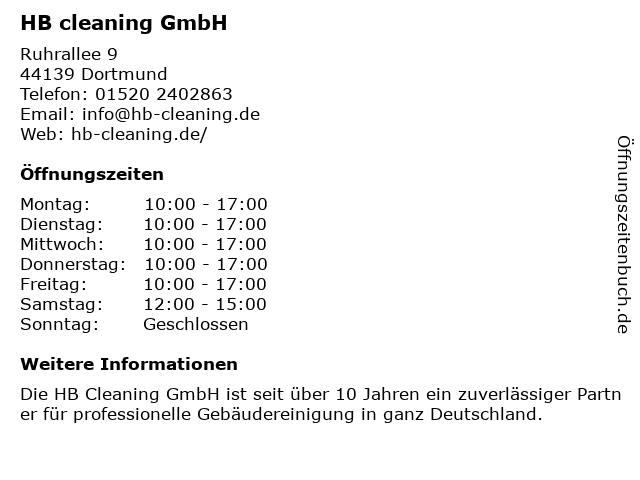 | Öffnungszeiten HB cleaning GmbH in Dortmund anzeigen | |