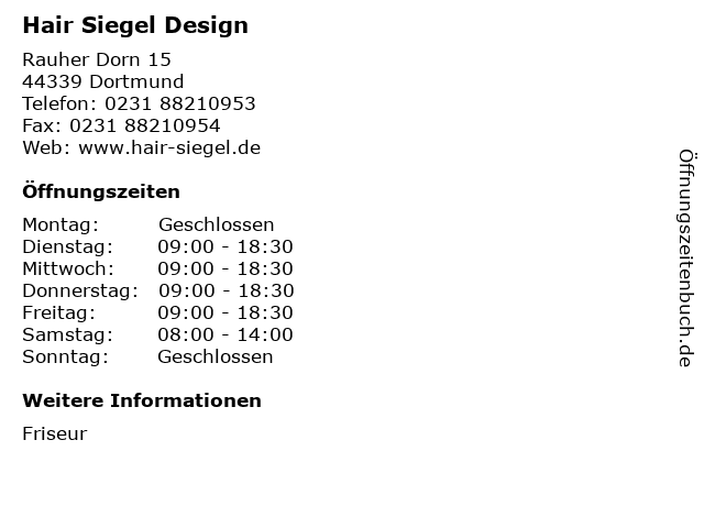 | Öffnungszeiten Hair Siegel Design in Dortmund anzeigen | |