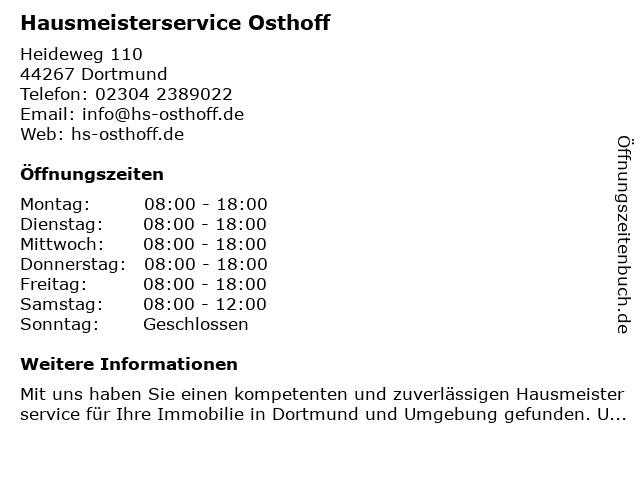 | Öffnungszeiten Hausmeisterservice Osthoff in Dortmund anzeigen | |