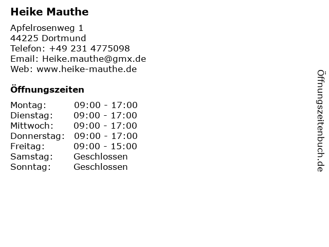 | Öffnungszeiten Heike Mauthe in Dortmund anzeigen | |