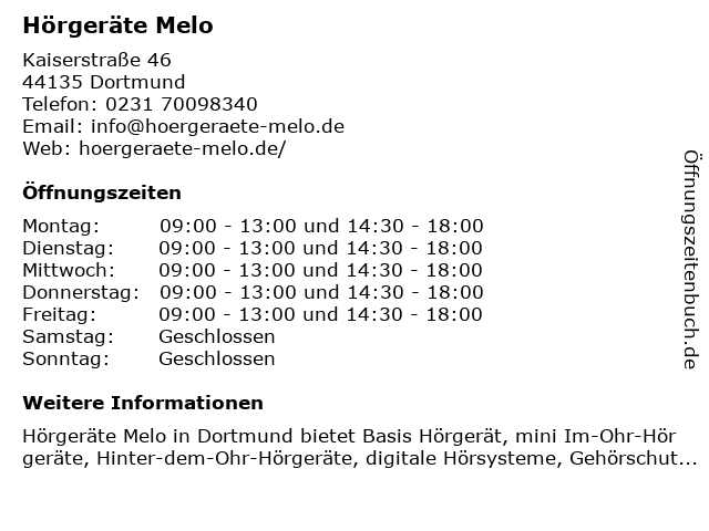 | Öffnungszeiten Hörgeräte Melo in Dortmund anzeigen | |