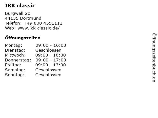 | Öffnungszeiten IKK classic in Dortmund anzeigen | |