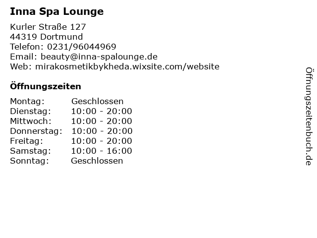 | Öffnungszeiten Inna Spa Lounge in Dortmund anzeigen | |
