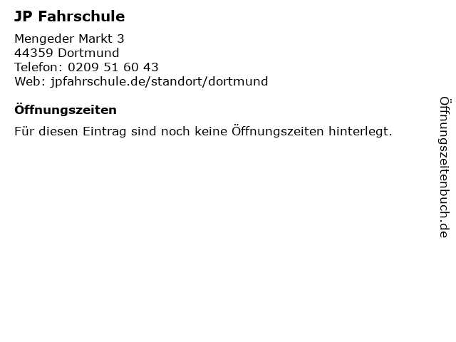 | Öffnungszeiten JP Fahrschule in Dortmund anzeigen | |