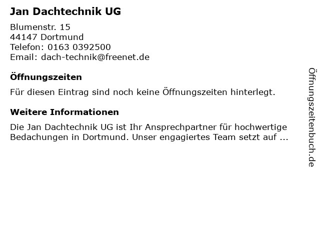 | Telefonnummer Jan Dachtechnik UG in Dortmund (0163 0392500) anrufen | |