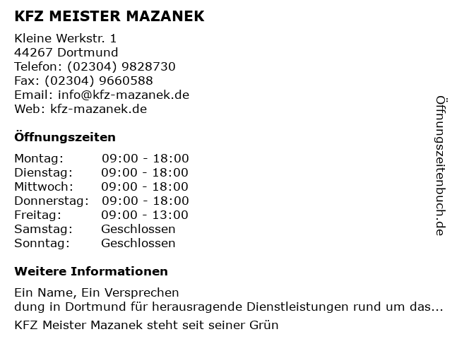 | Öffnungszeiten KFZ MEISTER MAZANEK in Dortmund anzeigen | |