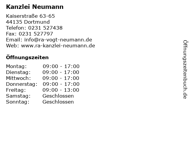 | Öffnungszeiten Kanzlei Neumann in Dortmund anzeigen | |