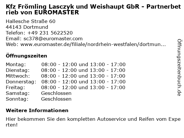 1 Kfz Frömling Lasczyk und Weishaupt GbR - Partnerbetrieb von EUROMASTER (Entfernung: 13,92 km) Jahnstr. 13, 58455 Witten 4 EUROMASTER GmbH, PKW-Service-Station Reifenservice (Entfernung: 13,47 km) Lünener Str. 30 -32, 59174 Kamen 6 KFZ-Frömling Lasczyk und Weishaupt GbR - Partnerbetrieb von Euromaster GbR (Entfernung: 19,53 km) Oskar-hoffmann-straße 61, 44789 Bochum |