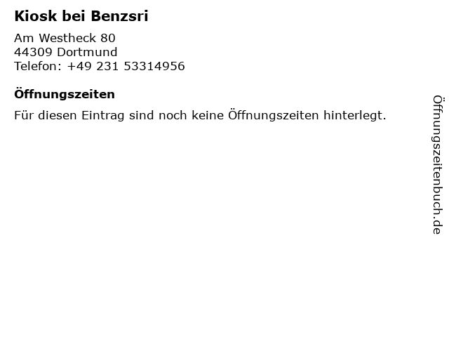 | Öffnungszeiten Kiosk bei Benzsri in Dortmund anzeigen | |