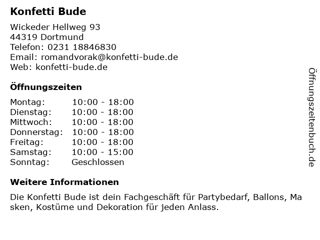 | Öffnungszeiten Konfetti Bude in Dortmund anzeigen | |