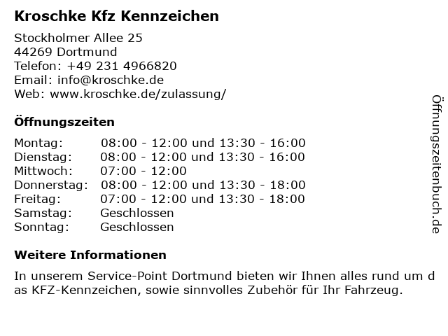 | Öffnungszeiten Kroschke Kfz Kennzeichen in Dortmund anzeigen | |