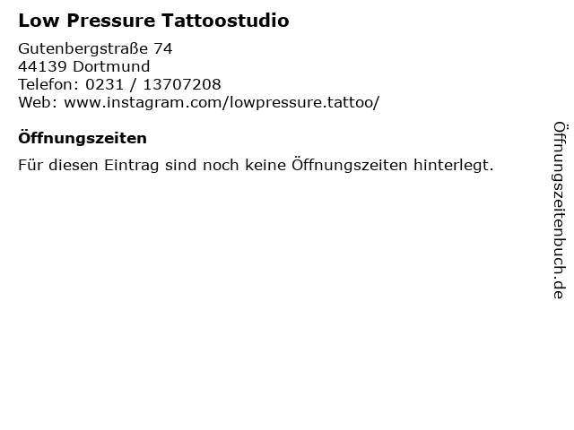 | Öffnungszeiten Low Pressure Tattoostudio in Dortmund anzeigen | |