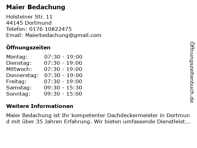 | Öffnungszeiten Maier Bedachung in Dortmund anzeigen | |