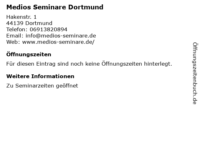 | Öffnungszeiten Medios Seminare Dortmund in Dortmund anzeigen | |