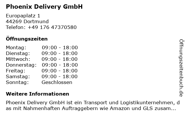 | Öffnungszeiten Phoenix Delivery GmbH in Dortmund anzeigen | |