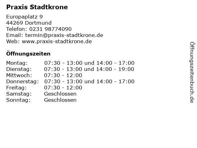 | Öffnungszeiten Praxis Stadtkrone in Dortmund anzeigen | |