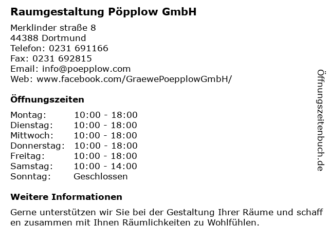 | Öffnungszeiten Raumgestaltung Pöpplow GmbH in Dortmund anzeigen | |