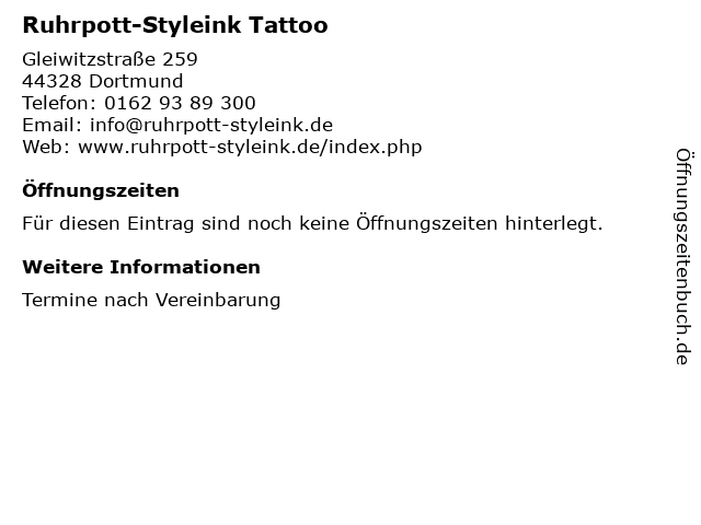 | Öffnungszeiten Ruhrpott-Styleink Tattoo in Dortmund anzeigen | |