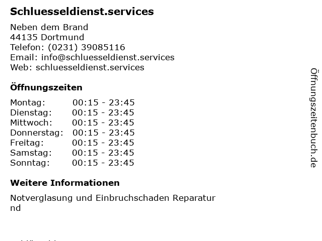 | Öffnungszeiten Schluesseldienst.services in Dortmund anzeigen | |
